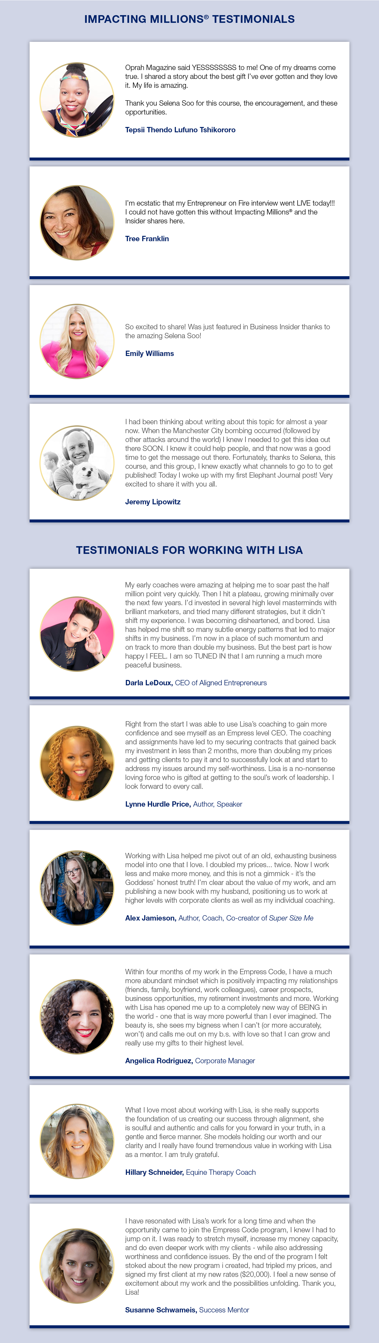 IMPACTING MILLIONS® teaches you how to connect with the media and land high-exposure opportunities, so you can get featured, published, and interviewed (so you can ultimately reach more people and impact more lives).